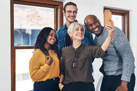 Is everyone ready. Cropped shot of a group of cheerful businesspeople taking a self portrait together with a cellphone inside of the office.