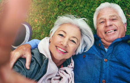 Retirementtime to enjoy yourselfie. a senior couple lying down on the grass and taking a selfie.