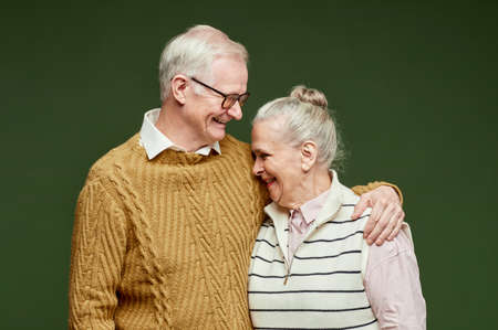 Laughing senior couple in casual clothes standing on dark green background, man in pullover embracing his wife
