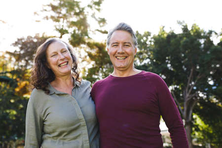Portrait of happy senior caucasian couple embracing, looking to camera in sunny garden. luxury retirement lifestyle, spending time at home.
