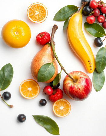 Overhead shot of a selection of fresh fruits, arranged in a flat lay style, with a focus on the vibrant colors and textures of each fruit