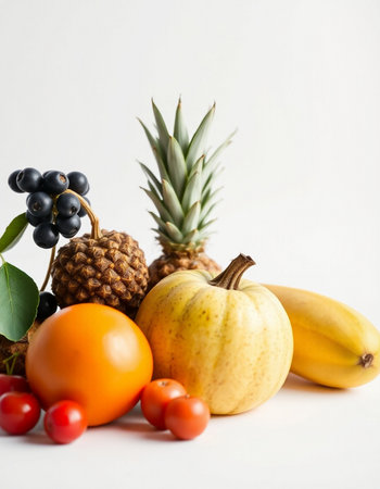 An abundant assortment of fresh, exotic fruits fills the scene, showing a vibrant blend of colors. The collection includes pineapples, grapes, oranges, and various berries, all intricately arranged against a lively backdrop of nature. This visually captivating display highlights the beauty of organic produce.