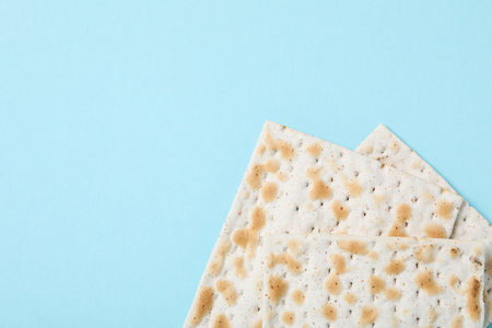 Traditional Jewish matzah on a blue background. Free space.
