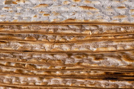 Pile of Jewish Matza Flatbread texture close-up, horizontal background