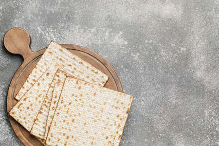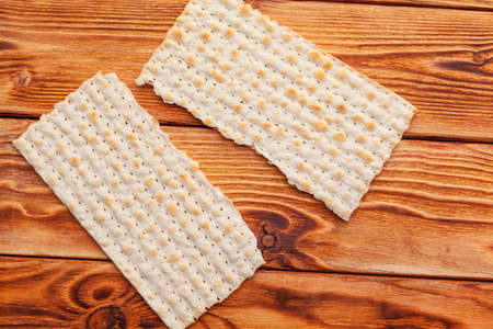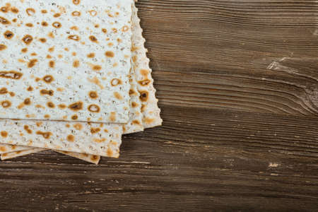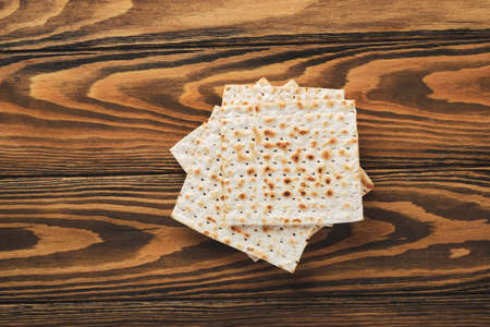 Traditional Jewish kosher matzo for Passover. Set with Passover matzos on wooden background. Pesach celebration