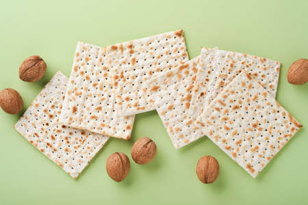 Passover celebration concept. Matzah, red kosher and walnut. Traditional ritual Jewish bread on light green background. Passover food. Pesach Jewish holiday.