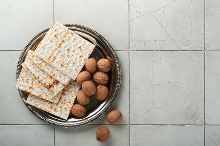Pile of jewish Passover matzah unleavened bread. Symbols of Passover-Jewish Matza. Table setting at home. Pesach celebration.