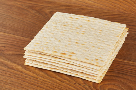 A pile of matzah isolated on a brown background. Matzah unleavened bread made only with flour and water. Jewish holiday of Pesach (Passover) concept.