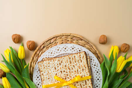 Traditional pesach plate of Jewish Pesach on Passover holiday celebration with kosher matzah unleavened bread