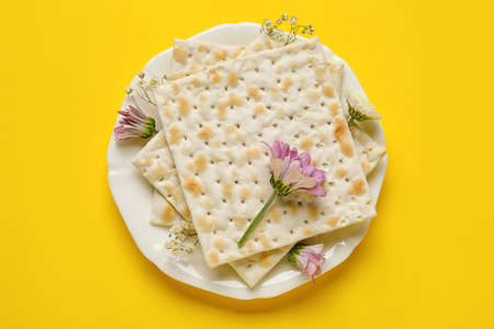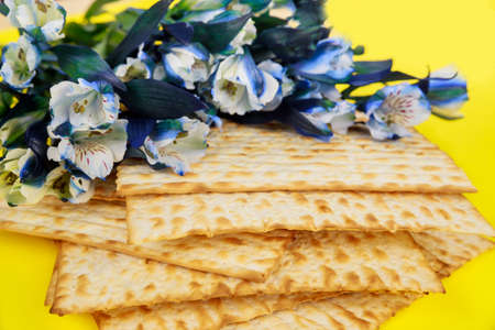 Jewish flatbread matza for Passover on yellow background, closeup