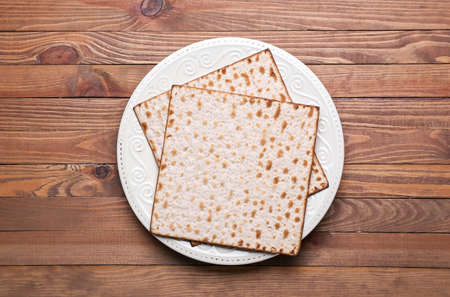 Plate with Jewish flatbread matza for Passover on wooden background