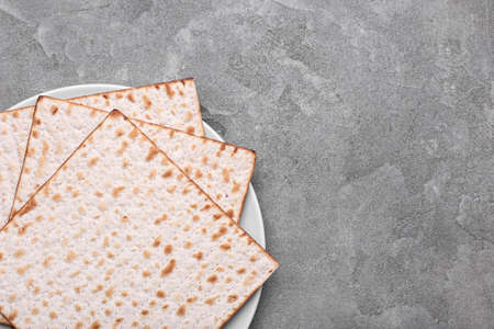 Plate with Jewish flatbread matza for Passover on gray background, closeup