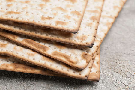 Stack of traditional matzos on gray table, above view