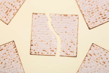 Matzo unleavened bread for Pesach, Jewish holiday of Passover. Matzah flatbreads isolated on yellow background.