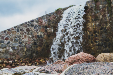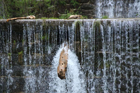 Water splashes on a large stone. Splashes of a small waterfall in the grotto. Park with a natural waterfall