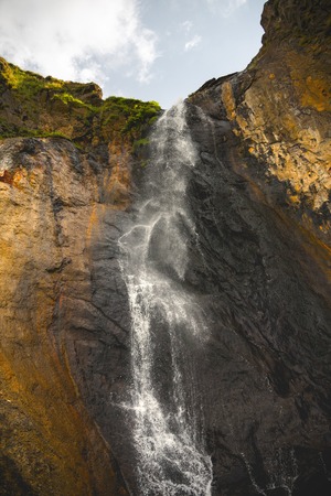 A vertical shot of a stony waterfall coming from the canyon and rocky cliffs