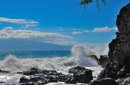 Waves breaking on the rocks on a sunny day during a spectacular ocean view on the Road to Hana, Maui, Hawaii, USA