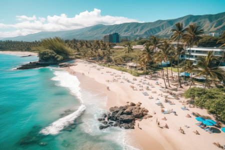 Aerial view of beautiful tropical beach and sea with coconut palm tree - Vintage Filter, Hawaii Beach Aerial, AI Generated