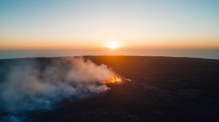 Dramatic sunset over a volcanic landscape with smoke and flames on the horizon