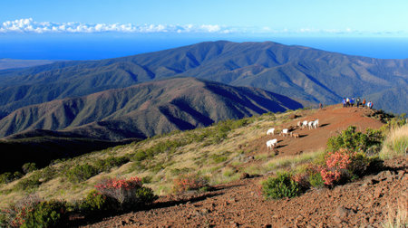 A breathtaking panoramic view from a mountain summit, featuring a flock of sheep on a trail, distant hikers, and the vast blue ocean under a clear sky.