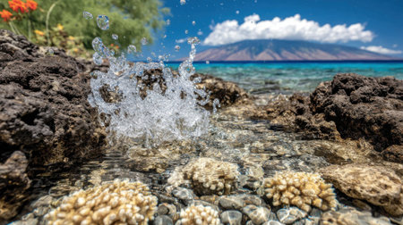 A dynamic splash of clear sea water erupts from a shallow tide pool filled with coral and volcanic rocks on a sunny tropical coast with a distant island view under a blue sky.