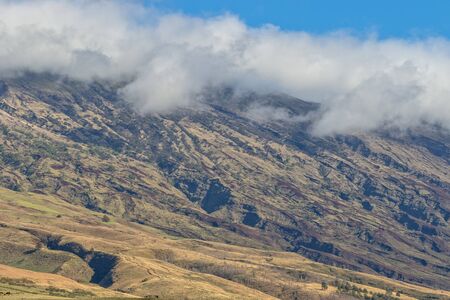 Lahaina, Maui, Hawaii, USA. - January 12 2012: Long shot on West coast dark ocean shoreline shows brown-yellow dry meadows, a town and 2 dark green-brown mountains under blue cloudscape.