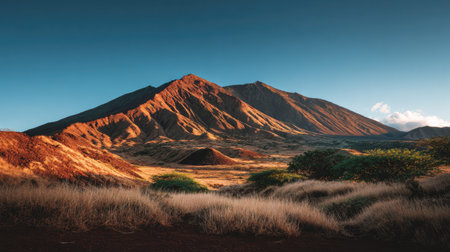 Stunning view of a majestic mountain surrounded by golden grass under a clear blue sky. An ideal representation of nature's beauty and tranquility in the wilderness.