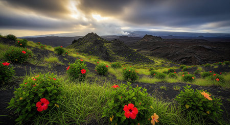 Lush green landscape with red hibiscus flowers and volcanic rock with a moody sky