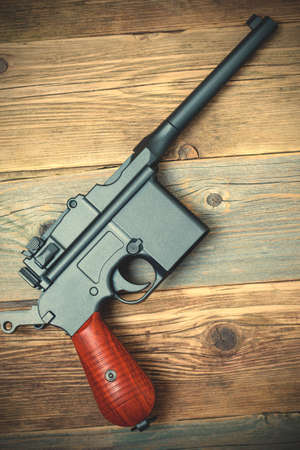 vintage submachine gun Mauser on old textured boards. image filter retro style