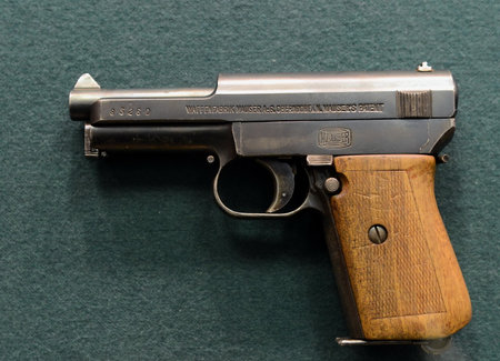 German compact self-loading pistol Mauser sample 1934 in the museum on Petrovka, 38, Main Department of the Ministry of Internal Affairs of Moscow.