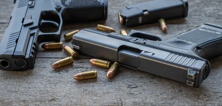 two handgun and Ammunition which contain full bullet on old wood background