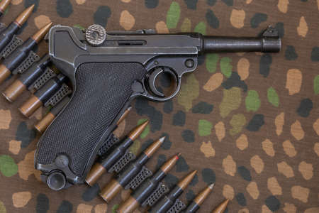 German Parabellum pistol and machine-gun belt with cartridges against the background of military camouflage. Accessories and weapons of the Second World War. Reconstruction of the combat equipment of the soldiers of the German army