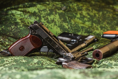 Weathered generic russian soviet semi-automatic 9mm pistols on pixel camouflage background