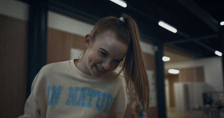 Joyful happy school girl playing table football closeup. Excited schoolgirl with ponytail scoring goal. Energetic smiling student enjoy foosball match after classes. Satisfied teen child win in game.