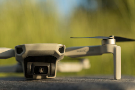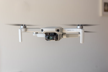 10 April 2022 - Krakow, Poland: Drone DJI Mavic Mini 2 flying in air.