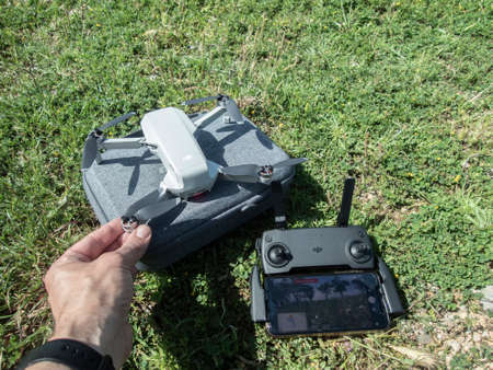 Barcelona, ​​March 29, 2020, dji mavic mini, the lightest drone with a weight of 249g and incredible flight and performance, pilot adjusting drone in his box