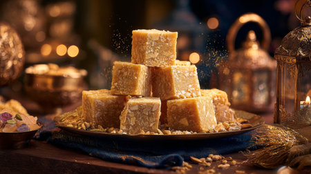 A beautifully styled plate of traditional Indian sweets illuminated by candles, showcasing cultural elements through rich textiles and warm ambiance for any festive occasion.
