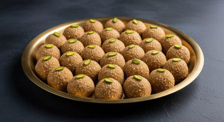 Traditional indian sweet ladoo on brass plate garnished with pistachios