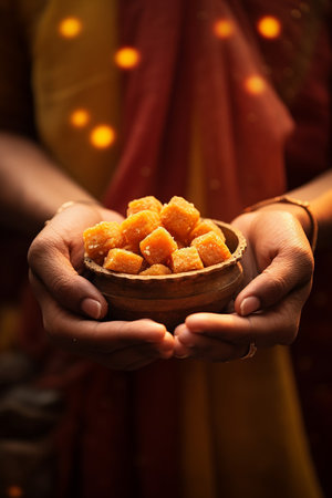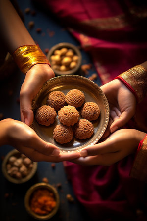 Indian Festival with Traditional Sweets Laddu and Pedha Amidst Illuminated Diyas.