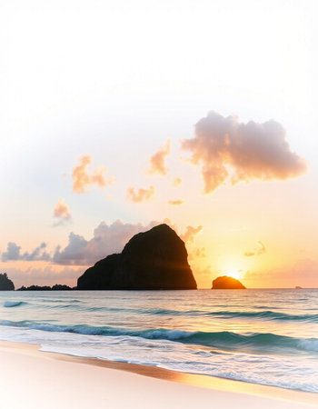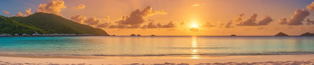 Experience the breathtaking beauty of a tropical paradise from an aerial view. This stunning image captures a vibrant coastline boasting turquoise waters, pristine sandy beaches, and majestic green mountains. Bathed in golden sunlight, the scene evokes a sense of tranquility and escape. Perfect for travel brochures, websites, or marketing materials promoting travel destinations and showcasing natural beauty, this image embodies the essence of a dream holiday. Explore the idyllic landscape and discover your next summer vacation inspiration.
