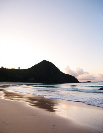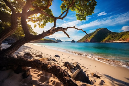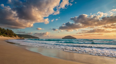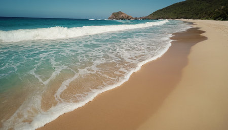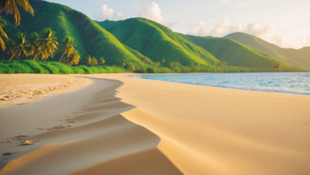 AI Generated. Scenic Tropical Beach with Golden Sand and Vibrant Green Hills