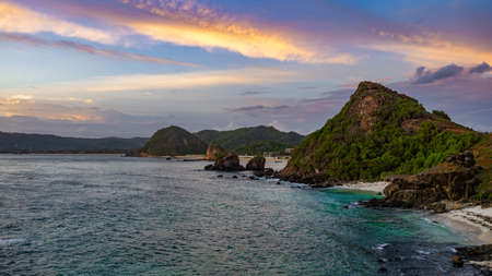 Colorful sunset at Merese Hill with a view of Tanjung Aan in Lombok, Indonesia, South-East Asia