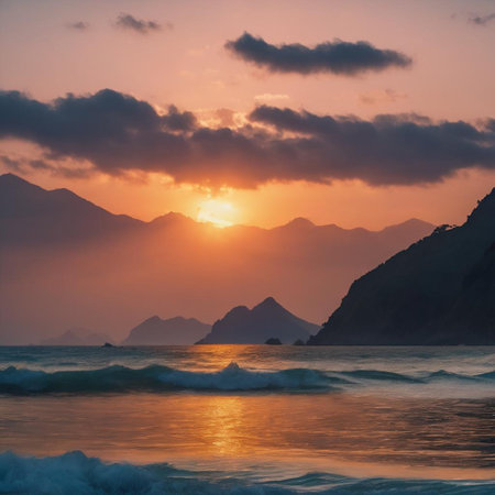 A beautiful beachscape: sunset horizon that creates a perfect harmony of sky, cloud, water, mountain, and sun