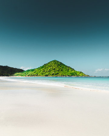 Beautiful landscape of Senggigi beach, Lombok island, scenic travel destination beach with crystal blue waters, Indonesia
