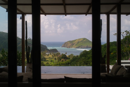 View from a luxury villa with a terrace and an infinity pool to the ocean and hills around the island. Tropical resort for honeymoon, peace and quiet. Romantic vacation.