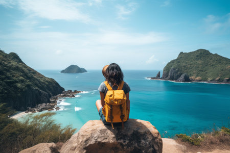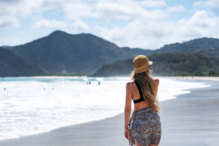 Tourist walking on sandy beach looking at ocean waves in tropical paradise