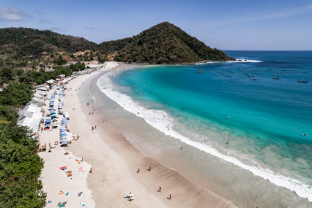 Tourists enjoying tanjung aan beach in lombok, indonesia on sunny day