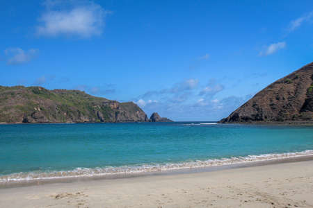 Beautiful scene on best desert beach with white sand, clear water on ocean bay Mawun in tropical island Lombok. Boundless tropic beach with no people in lost paradise. Travel and vacation in Indonesia