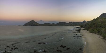 Wide scenic golden morning view of untouched beach, hills and RInjani volcano shot in Sumbawa island, NTB, Indonesia