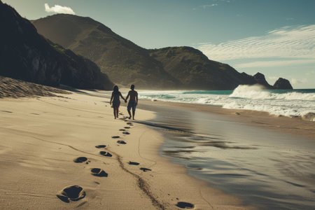 A husband and wife holding hands while walking along a secluded beach.. --ar 3:2 Job ID: ec44afa3-b50a-415e-8496-1c7f48e10d42